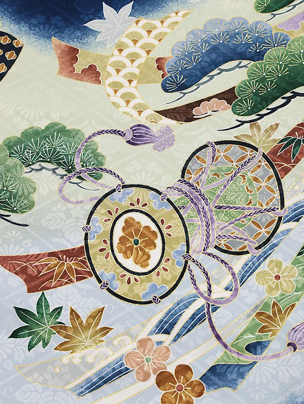 お祝い着をかける時は 絵柄がよく見える様に広げ抱いた子供の体を覆う様に掛け産着の付紐の一方を肩側から他方を脇から通して 抱き手の方の背で蝶結びにします。