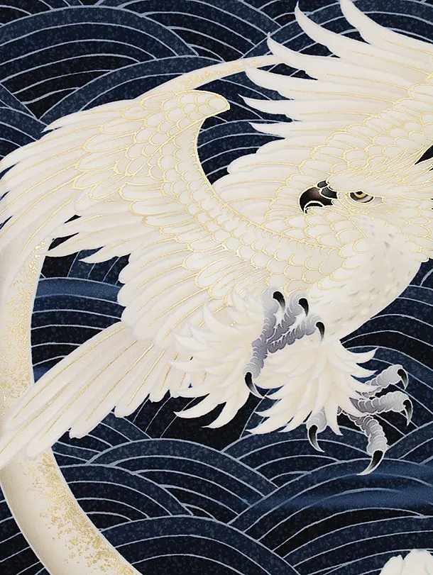 お祝い着をかける時は 絵柄がよく見える様に広げ抱いた子供の体を覆う様に掛け産着の付紐の一方を肩側から他方を脇から通して 抱き手の方の背で蝶結びにします。