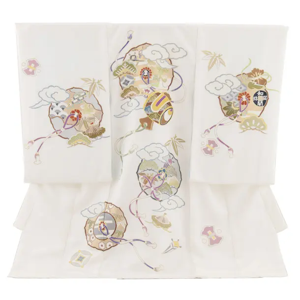 お祝い着をかける時は 絵柄がよく見える様に広げ抱いた子供の体を覆う様に掛け産着の付紐の一方を肩側から他方を脇から通して 抱き手の方の背で蝶結びにします。
