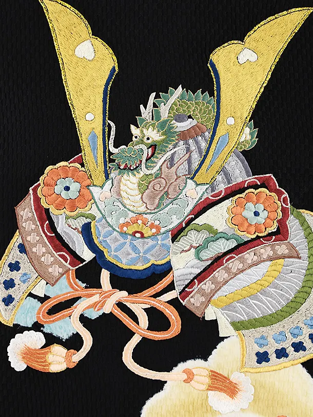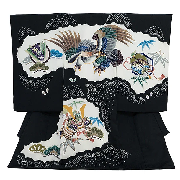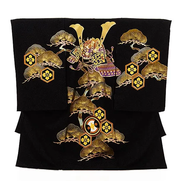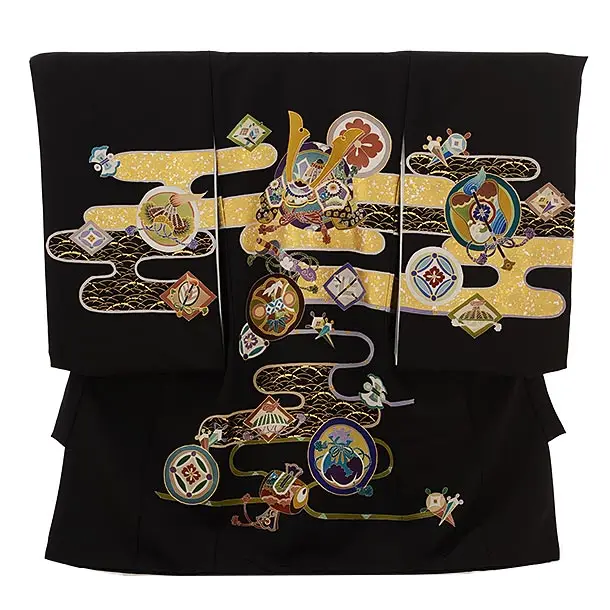 男児産着 お宮参りレンタル2639【正絹】黒地 兜刺繍に軍配