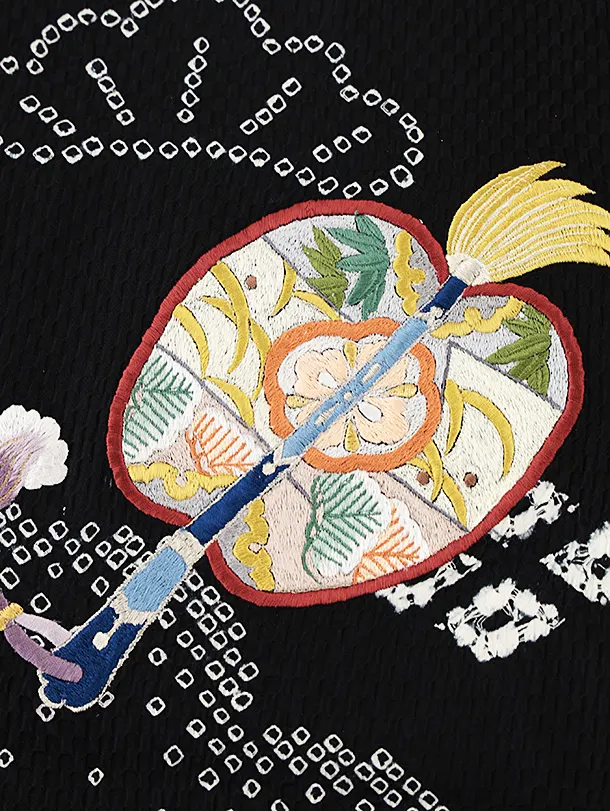 お祝い着をかける時は 絵柄がよく見える様に広げ抱いた子供の体を覆う様に掛け産着の付紐の一方を肩側から他方を脇から通して 抱き手の方の背で蝶結びにします。