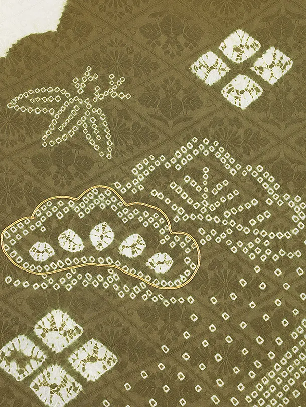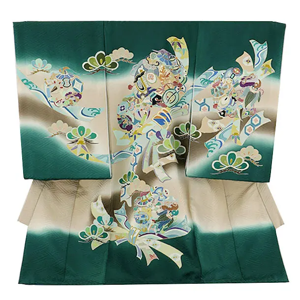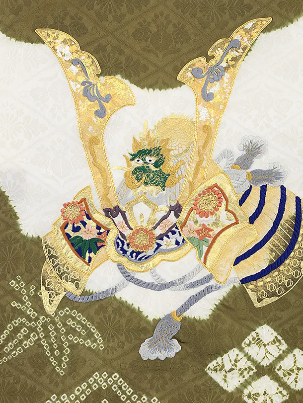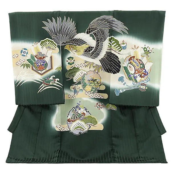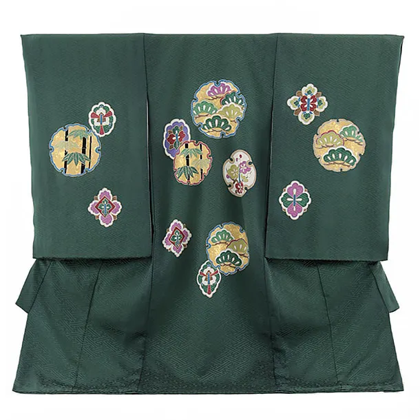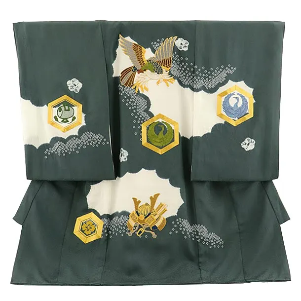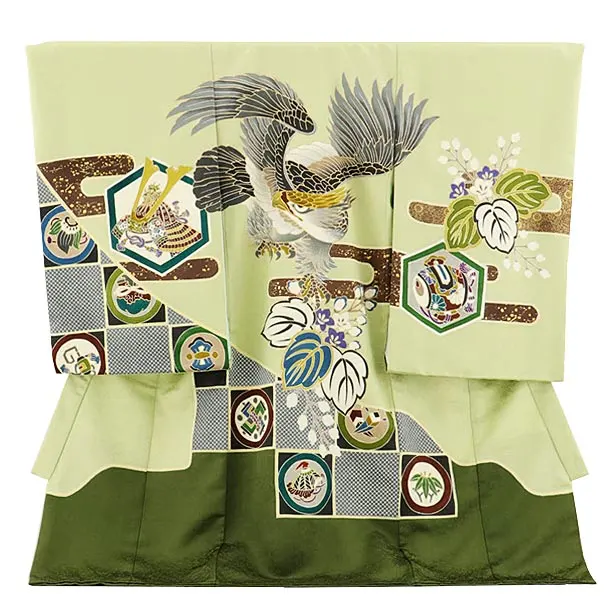 男児産着 お宮参りレンタル2642【正絹】抹茶色 兜刺繍に松