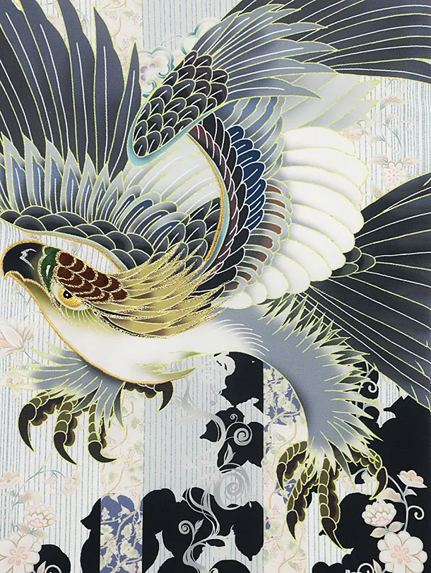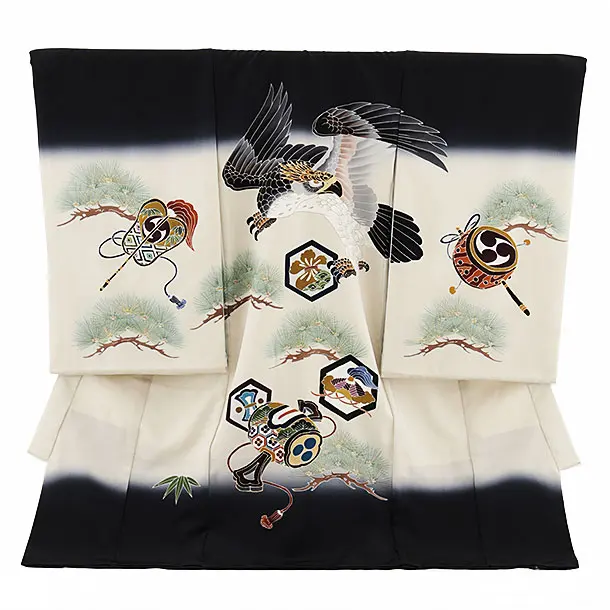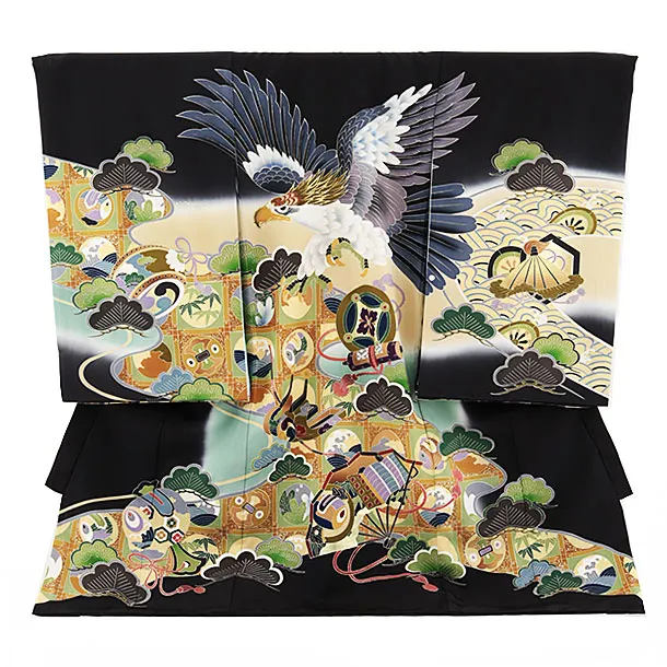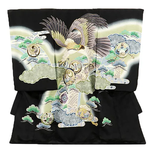 男児産着 お宮参りレンタル2692 水色×黒 更紗に鷹