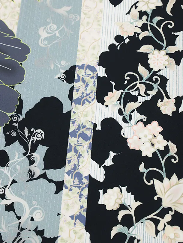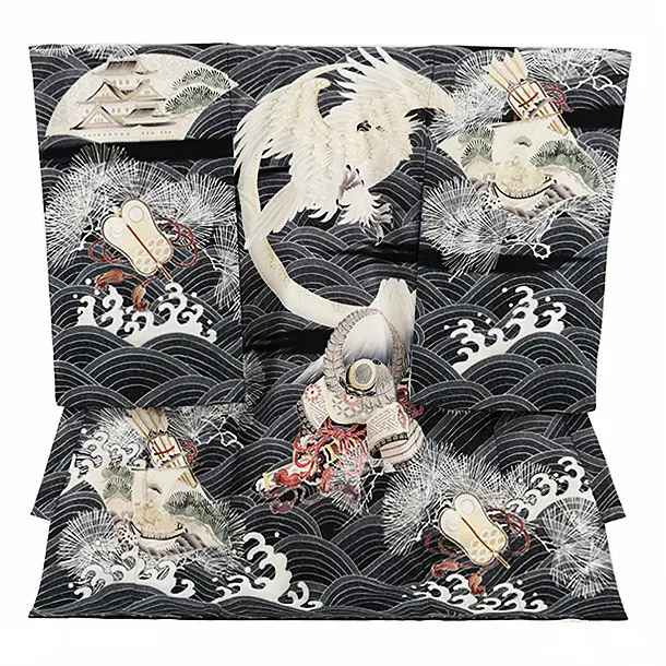 お祝い着をかける時は 絵柄がよく見える様に広げ抱いた子供の体を覆う様に掛け産着の付紐の一方を肩側から他方を脇から通して 抱き手の方の背で蝶結びにします。