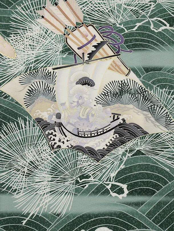 男児産着 お宮参りレンタル2741 華徒然 緑地 鷹に戦国武将