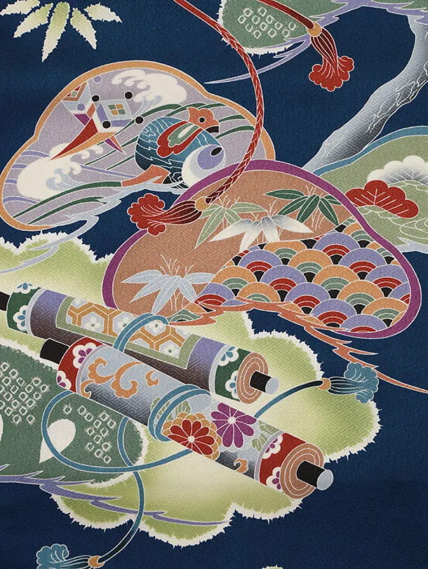 お祝い着をかける時は 絵柄がよく見える様に広げ抱いた子供の体を覆う様に掛け産着の付紐の一方を肩側から他方を脇から通して 抱き手の方の背で蝶結びにします。