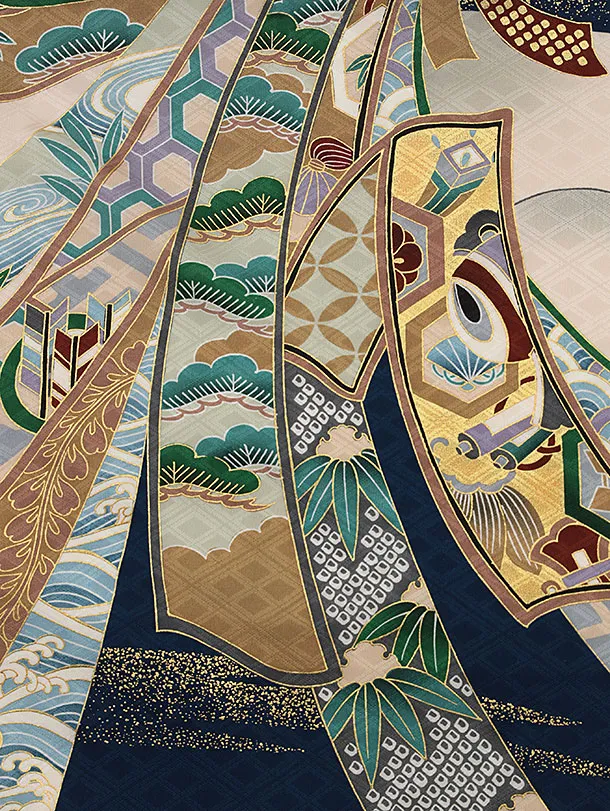 お祝い着をかける時は 絵柄がよく見える様に広げ抱いた子供の体を覆う様に掛け産着の付紐の一方を肩側から他方を脇から通して 抱き手の方の背で蝶結びにします。