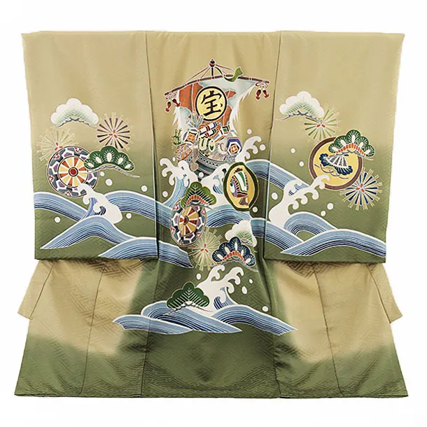 お祝い着をかける時は 絵柄がよく見える様に広げ抱いた子供の体を覆う様に掛け産着の付紐の一方を肩側から他方を脇から通して 抱き手の方の背で蝶結びにします。