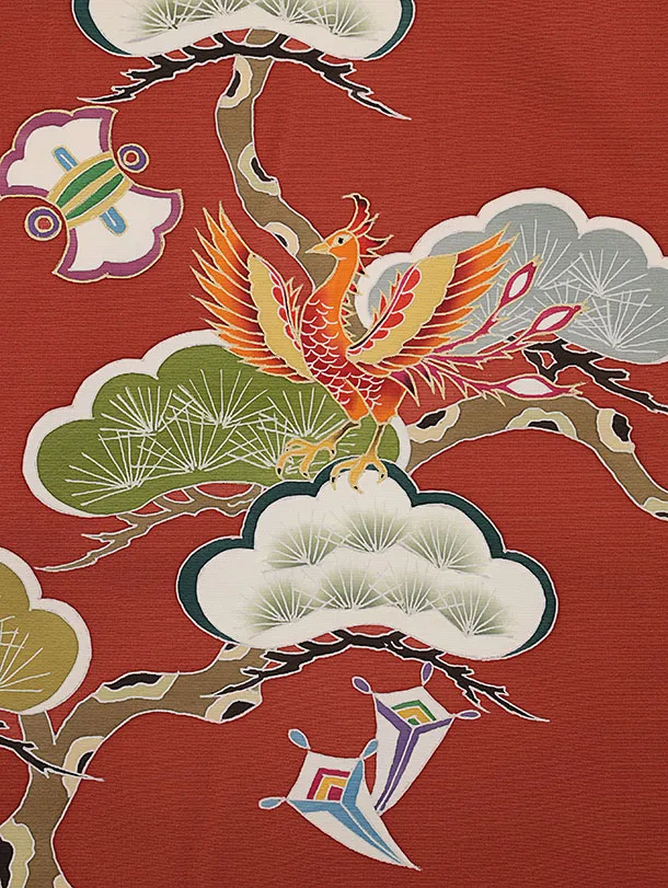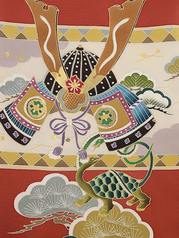 お祝い着をかける時は 絵柄がよく見える様に広げ抱いた子供の体を覆う様に掛け産着の付紐の一方を肩側から他方を脇から通して 抱き手の方の背で蝶結びにします。