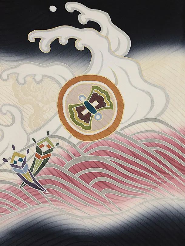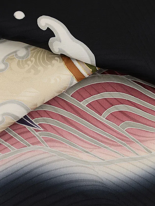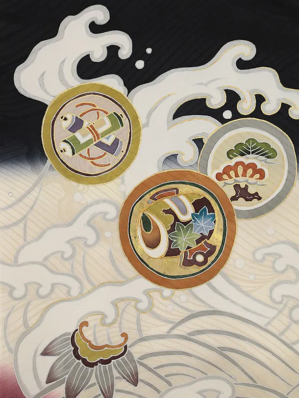 男児産着 お宮参りレンタル2748【正絹】黒地 波に吉祥文様丸紋