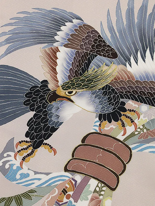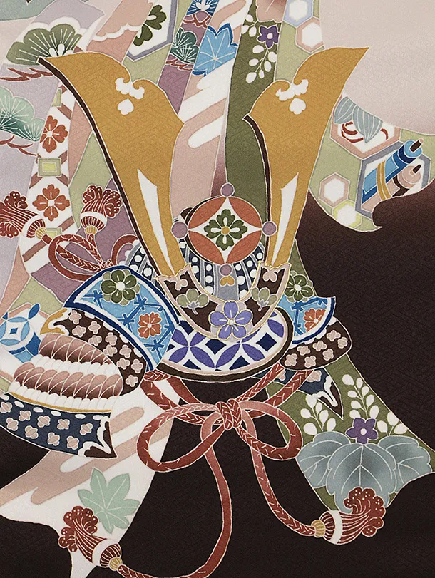 男児産着 お宮参りレンタル2752 ベージュ×茶 鷹と兜に束ね熨斗