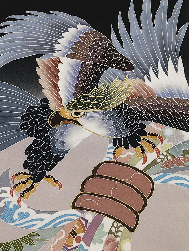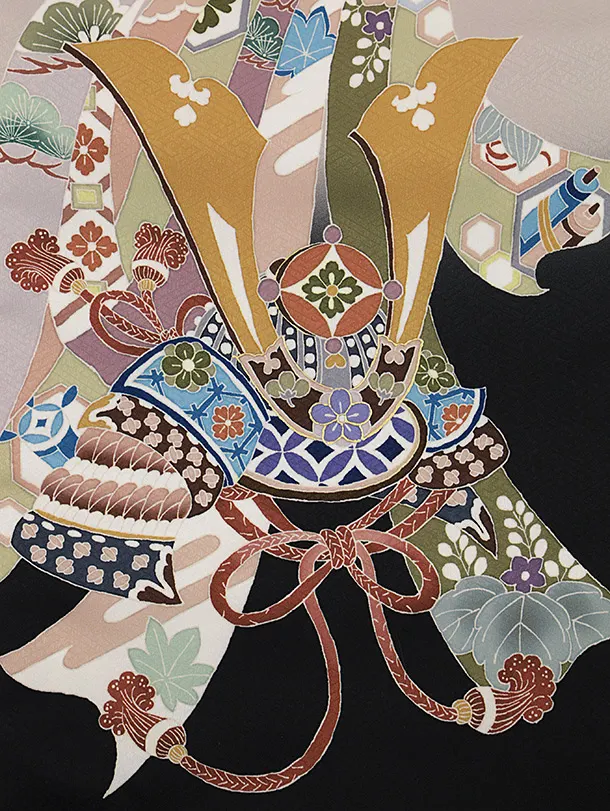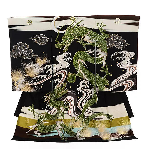 男児産着 お宮参りレンタル2755 黒地 鷹と兜に束ね熨斗