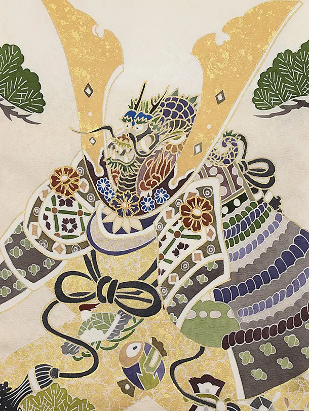 男児産着 お宮参りレンタル2777【高級正絹】ベージュ 兜に城松
