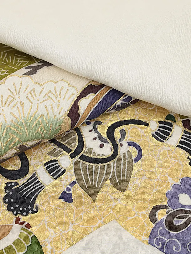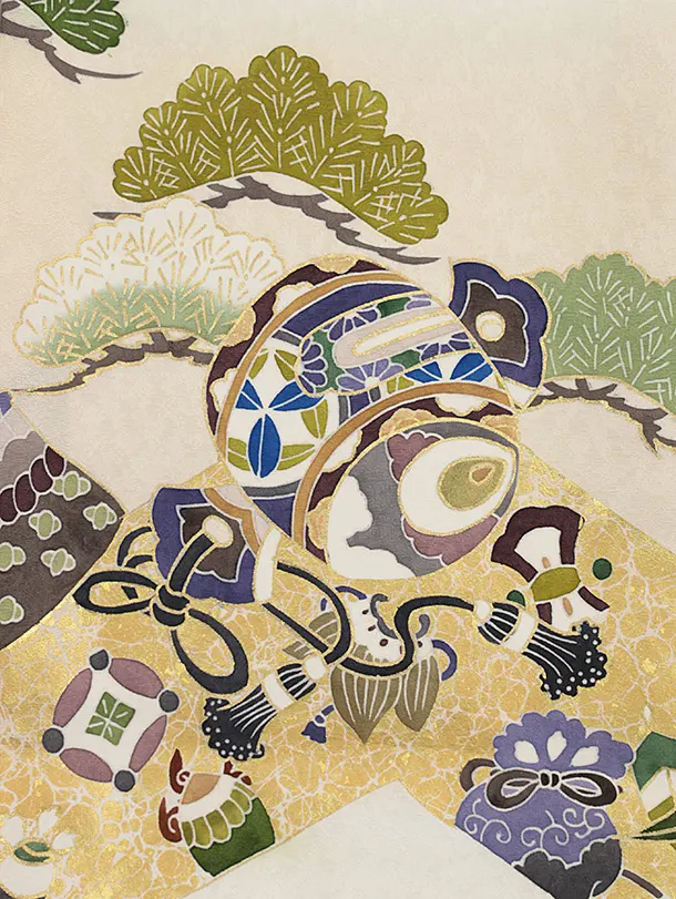 お祝い着をかける時は 絵柄がよく見える様に広げ抱いた子供の体を覆う様に掛け産着の付紐の一方を肩側から他方を脇から通して 抱き手の方の背で蝶結びにします。