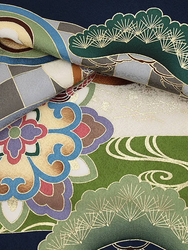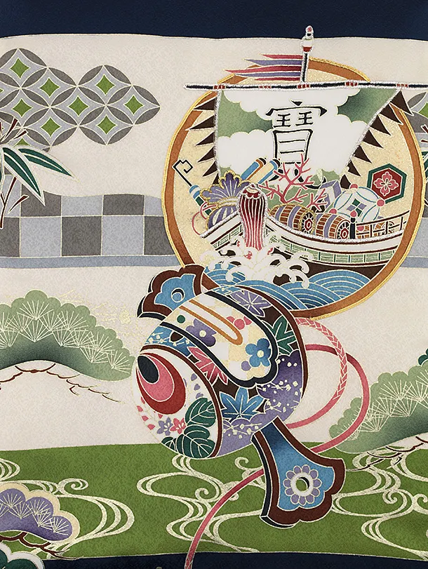 男児産着 お宮参りレンタル2782【正絹】紺地 宝船と小槌に松