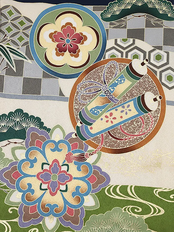 お祝い着をかける時は 絵柄がよく見える様に広げ抱いた子供の体を覆う様に掛け産着の付紐の一方を肩側から他方を脇から通して 抱き手の方の背で蝶結びにします。