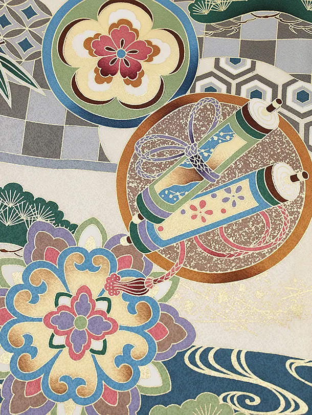 お祝い着をかける時は 絵柄がよく見える様に広げ抱いた子供の体を覆う様に掛け産着の付紐の一方を肩側から他方を脇から通して 抱き手の方の背で蝶結びにします。