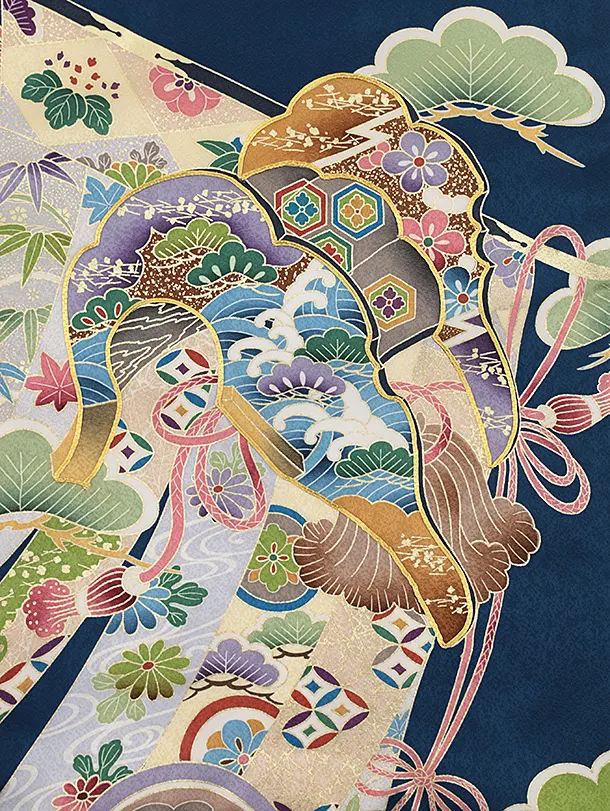 お祝い着をかける時は 絵柄がよく見える様に広げ抱いた子供の体を覆う様に掛け産着の付紐の一方を肩側から他方を脇から通して 抱き手の方の背で蝶結びにします。