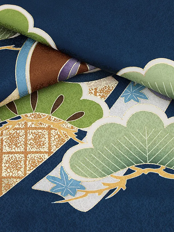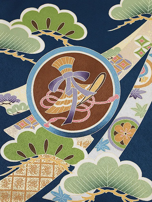 男児産着 お宮参りレンタル2784【正絹】青地 几帳に松と丸紋