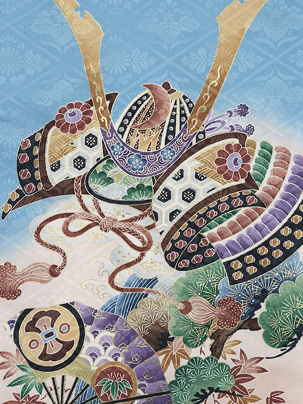 夏用 男児産着 お宮参り 2820 単衣 水色 兜に松