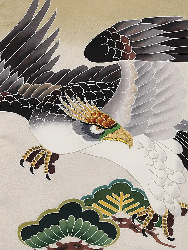 男児産着 お宮参りレンタル2827【正絹】ベージュ 鷹に雉 宝尽くし