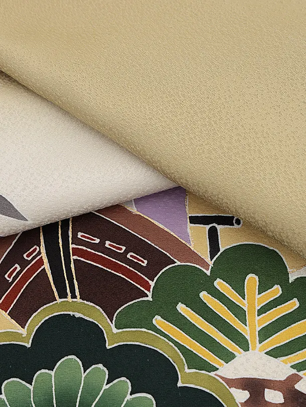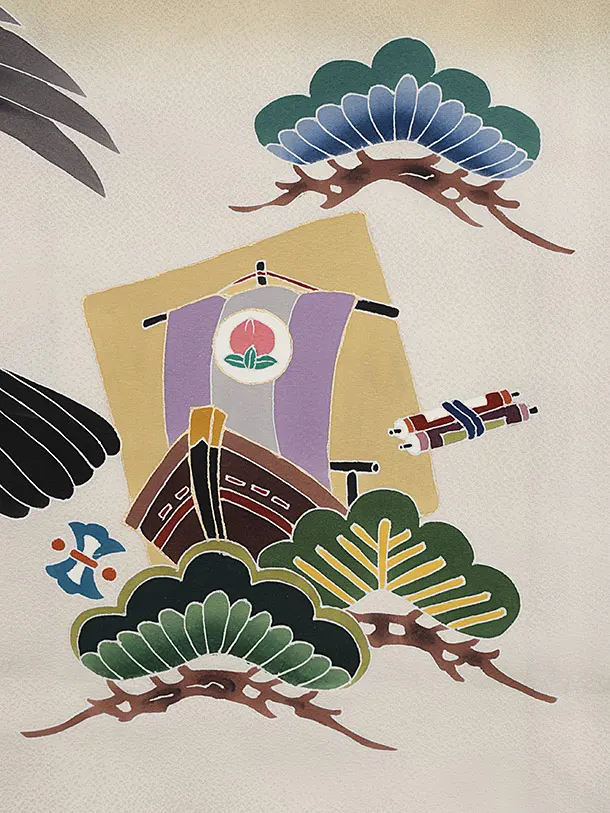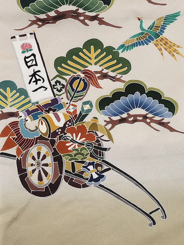 お祝い着をかける時は 絵柄がよく見える様に広げ抱いた子供の体を覆う様に掛け産着の付紐の一方を肩側から他方を脇から通して 抱き手の方の背で蝶結びにします。
