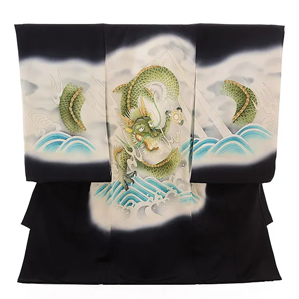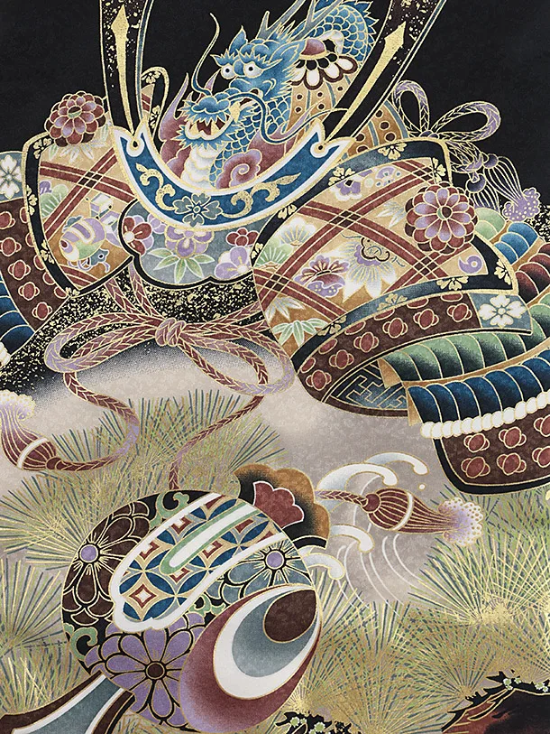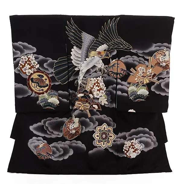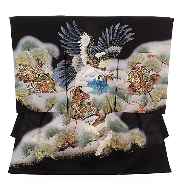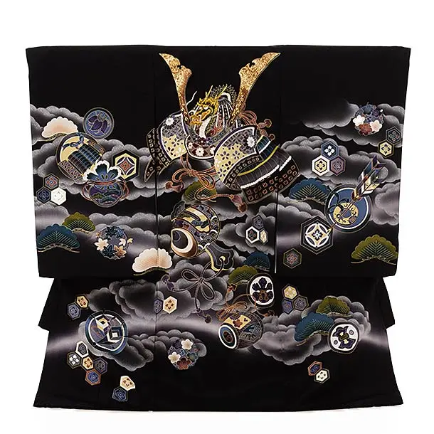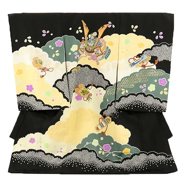 男児産着 お宮参りレンタル2855 黒地 兜と小槌 松波