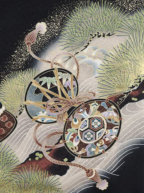 お祝い着をかける時は 絵柄がよく見える様に広げ抱いた子供の体を覆う様に掛け産着の付紐の一方を肩側から他方を脇から通して 抱き手の方の背で蝶結びにします。