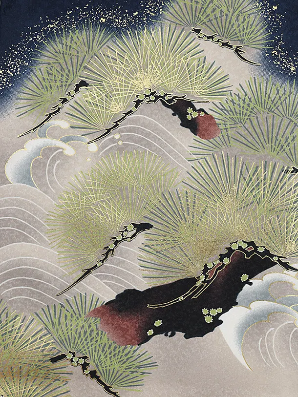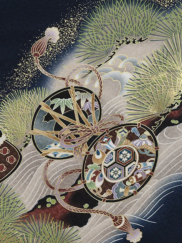 お祝い着をかける時は 絵柄がよく見える様に広げ抱いた子供の体を覆う様に掛け産着の付紐の一方を肩側から他方を脇から通して 抱き手の方の背で蝶結びにします。