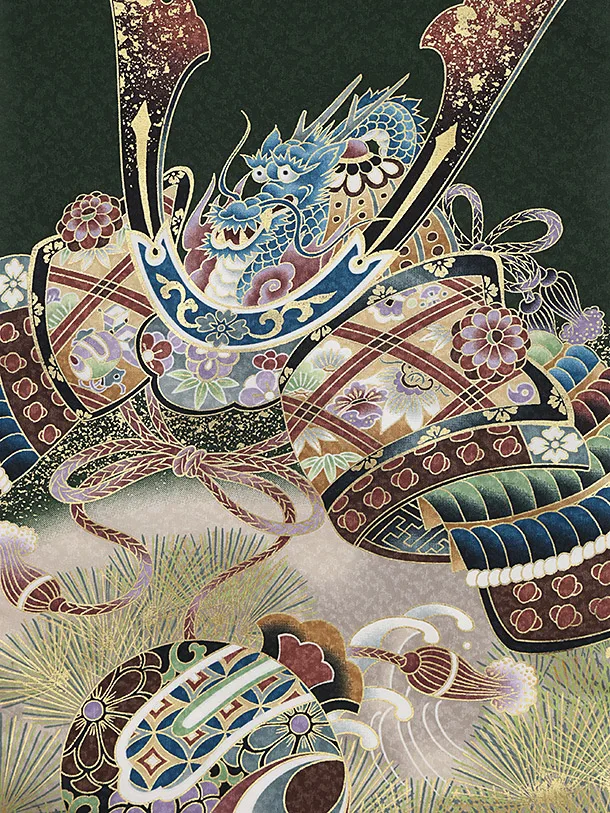 男児産着 お宮参りレンタル2857 緑地 兜と小槌 松波