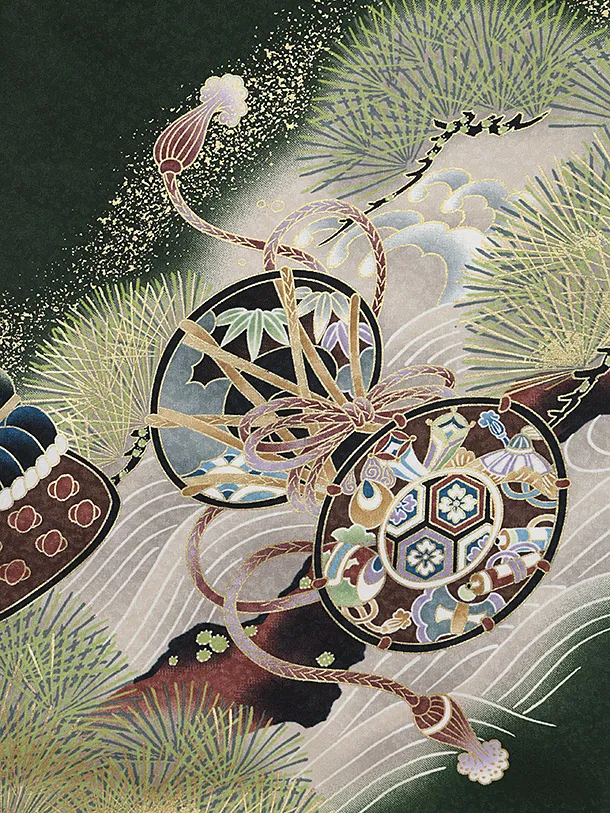 お祝い着をかける時は 絵柄がよく見える様に広げ抱いた子供の体を覆う様に掛け産着の付紐の一方を肩側から他方を脇から通して 抱き手の方の背で蝶結びにします。