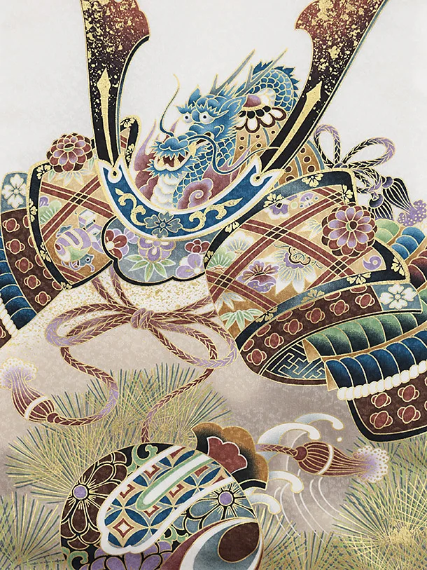 男児産着 お宮参りレンタル2859 白地 兜と小槌 松波