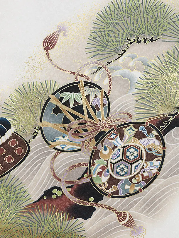 お祝い着をかける時は 絵柄がよく見える様に広げ抱いた子供の体を覆う様に掛け産着の付紐の一方を肩側から他方を脇から通して 抱き手の方の背で蝶結びにします。