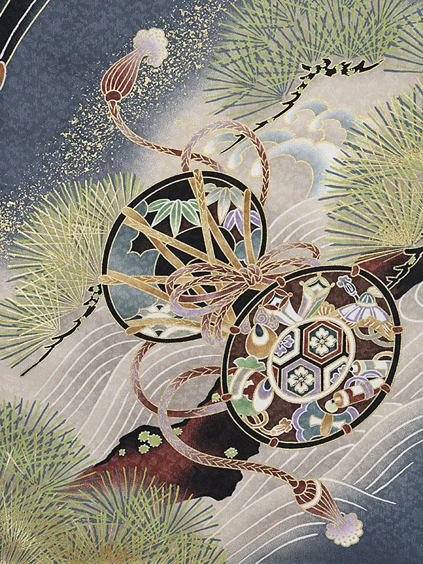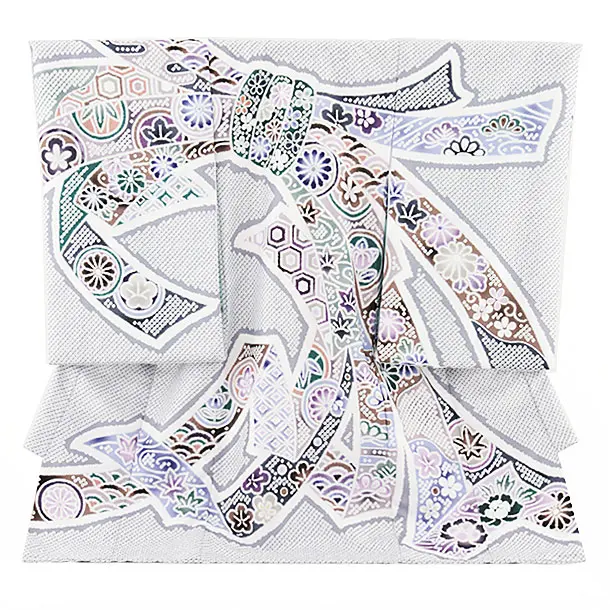 お祝い着をかける時は 絵柄がよく見える様に広げ抱いた子供の体を覆う様に掛け産着の付紐の一方を肩側から他方を脇から通して 抱き手の方の背で蝶結びにします。