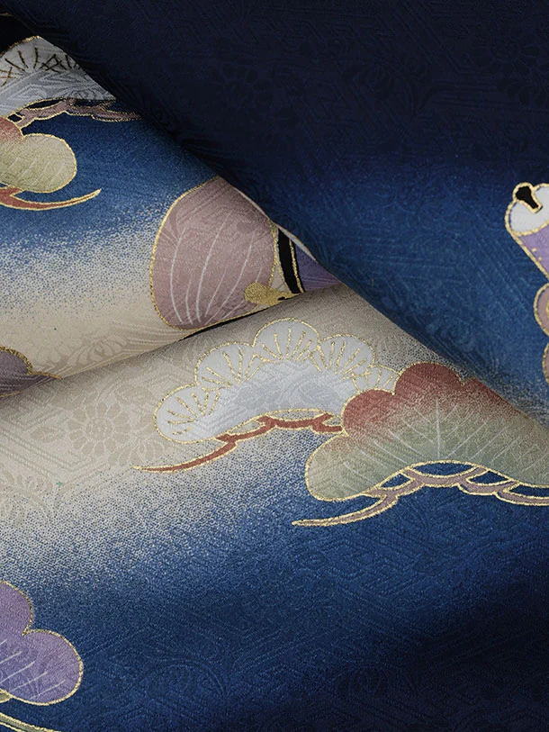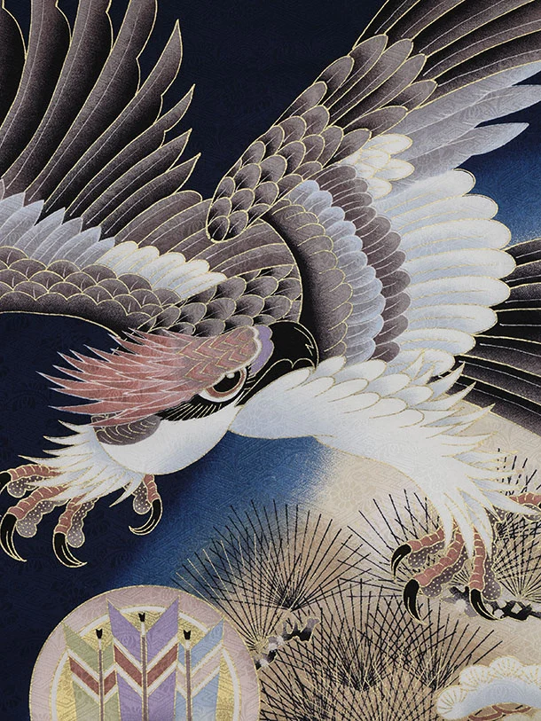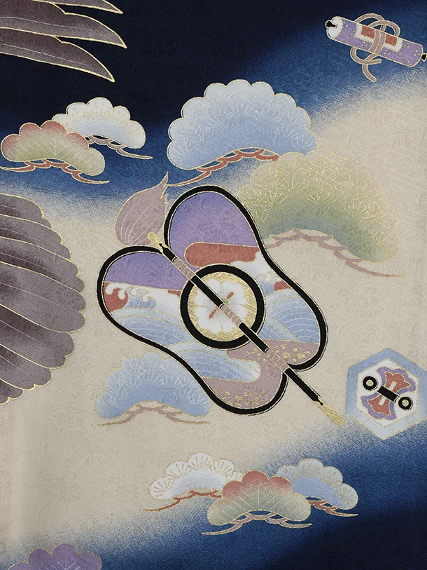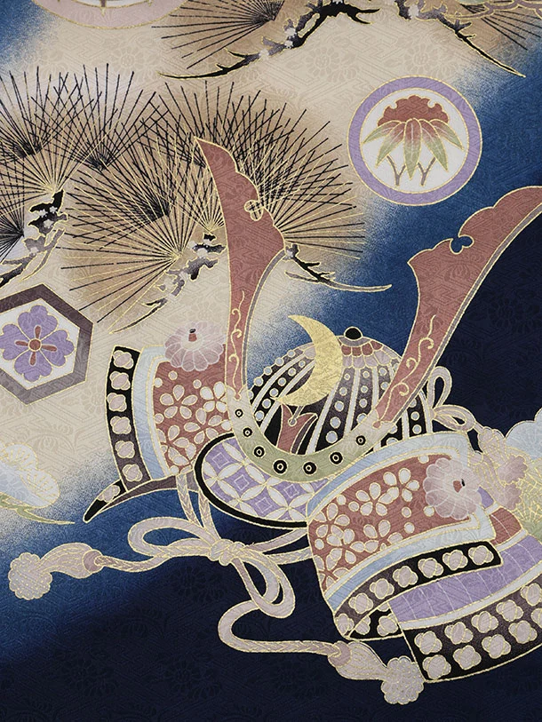 男児産着 お宮参りレンタル2895【正絹】紺地 鷹と兜 宝尽くしに丸紋