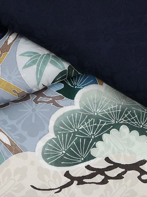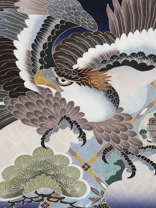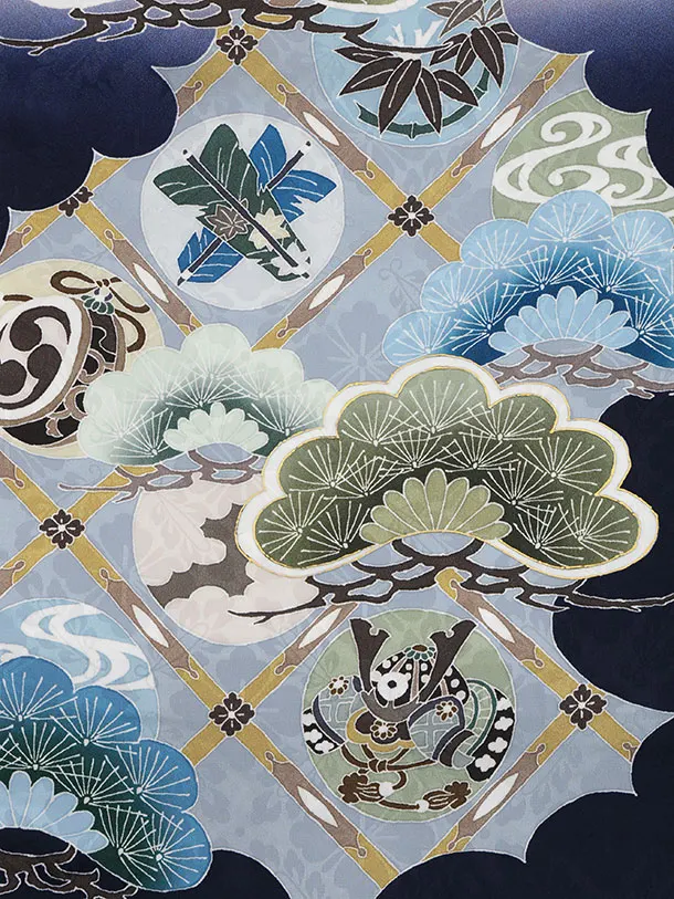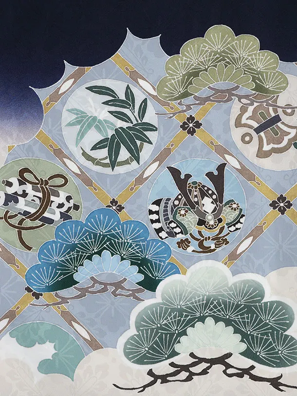 男児産着 お宮参りレンタル2930【正絹】青地 鷹 格子に丸紋