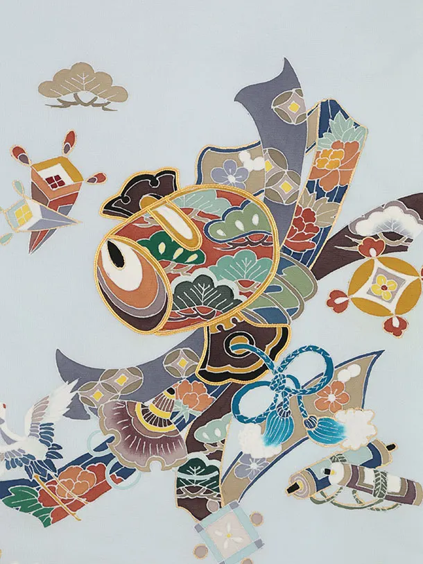 お祝い着をかける時は 絵柄がよく見える様に広げ抱いた子供の体を覆う様に掛け産着の付紐の一方を肩側から他方を脇から通して 抱き手の方の背で蝶結びにします。