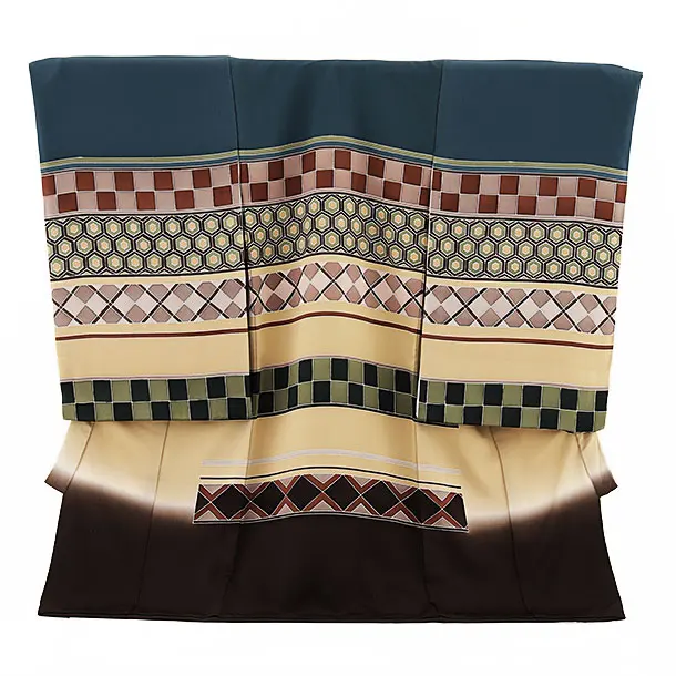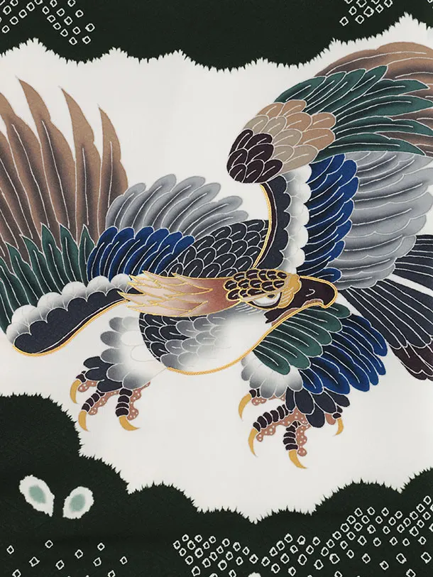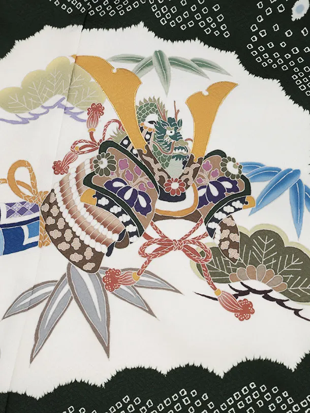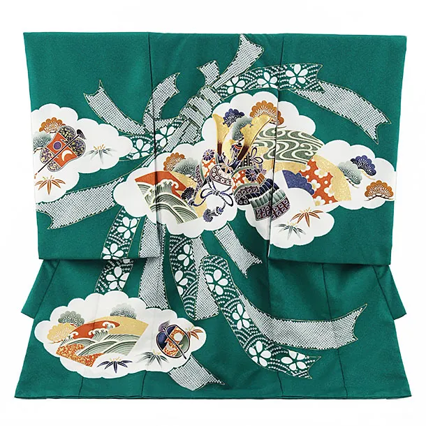 男児産着 お宮参りレンタル2934 グリーン 雲取り 鷹と兜 松