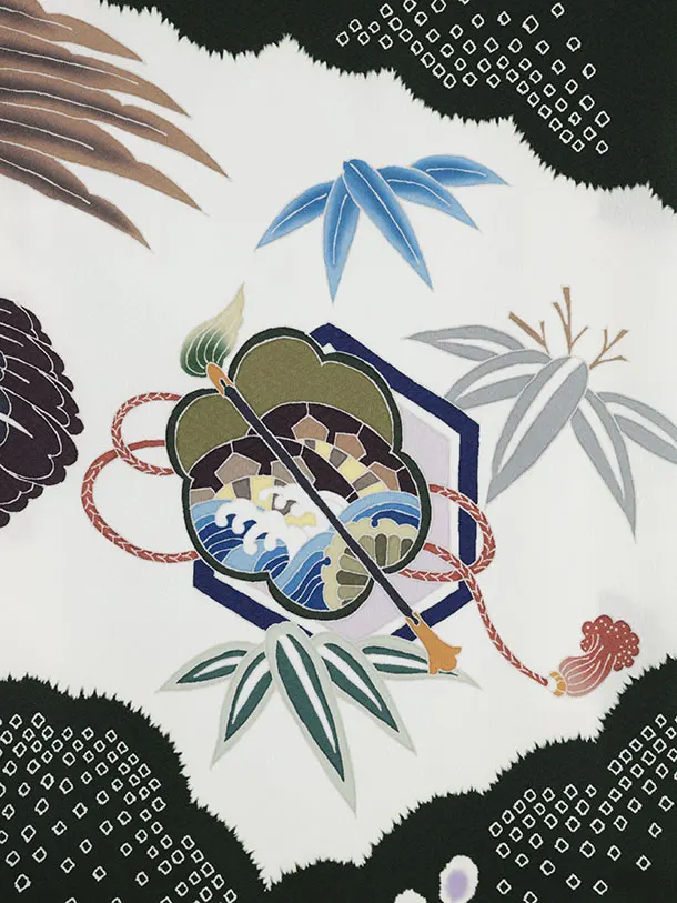 お祝い着をかける時は 絵柄がよく見える様に広げ抱いた子供の体を覆う様に掛け産着の付紐の一方を肩側から他方を脇から通して 抱き手の方の背で蝶結びにします。