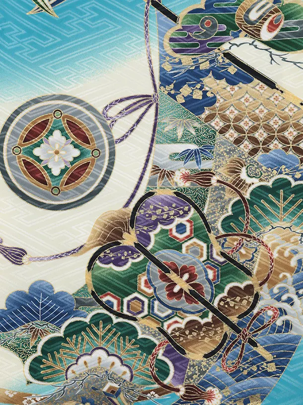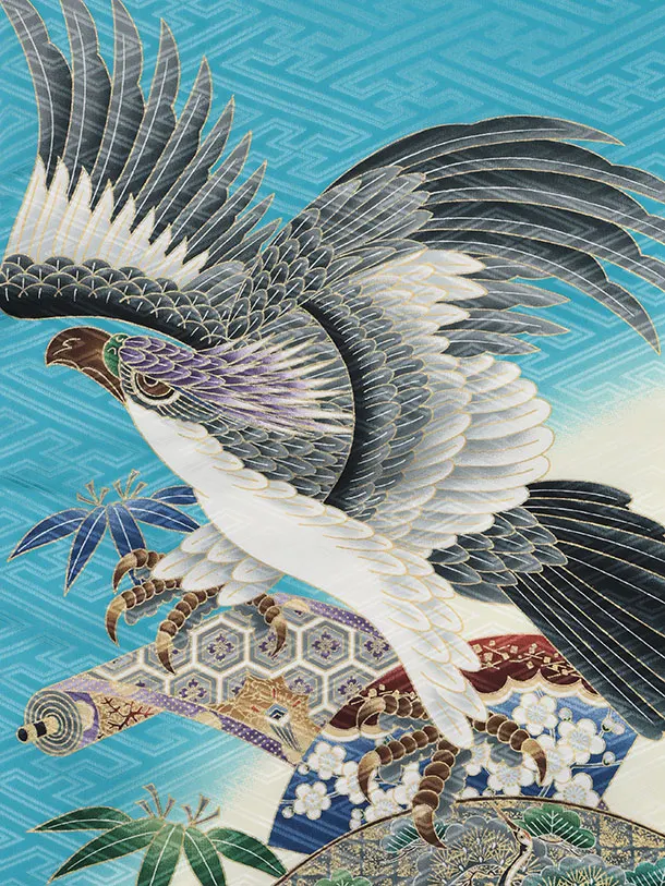 男児産着 お宮参りレンタル2938 水色地 鷹に武具