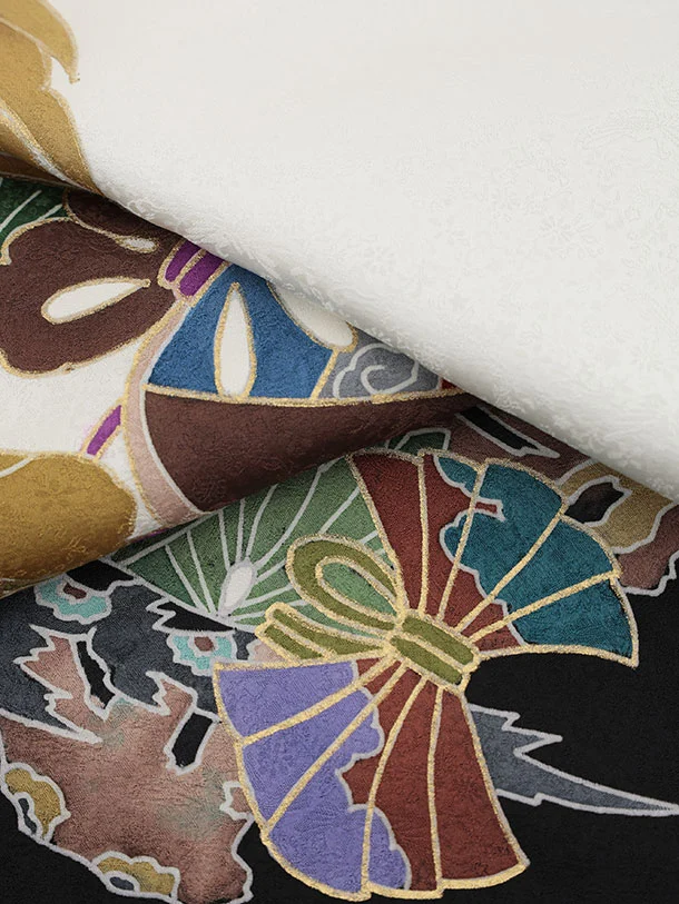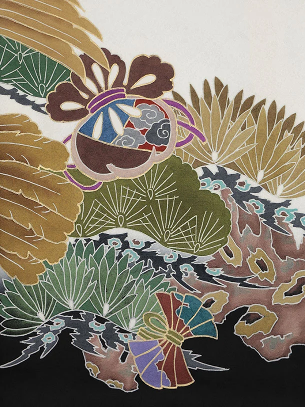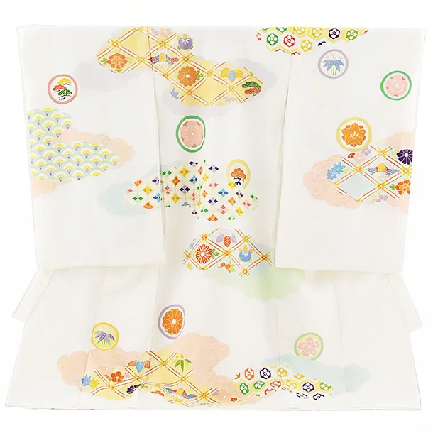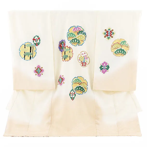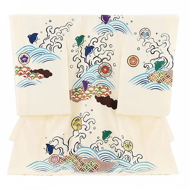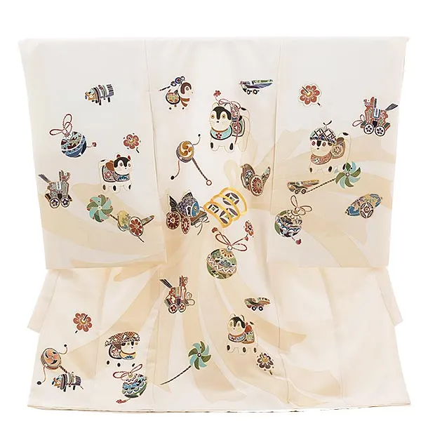 お祝い着をかける時は 絵柄がよく見える様に広げ抱いた子供の体を覆う様に掛け産着の付紐の一方を肩側から他方を脇から通して 抱き手の方の背で蝶結びにします。