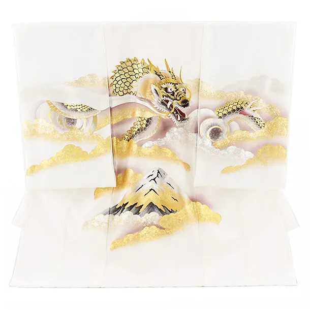 お祝い着をかける時は 絵柄がよく見える様に広げ抱いた子供の体を覆う様に掛け産着の付紐の一方を肩側から他方を脇から通して 抱き手の方の背で蝶結びにします。