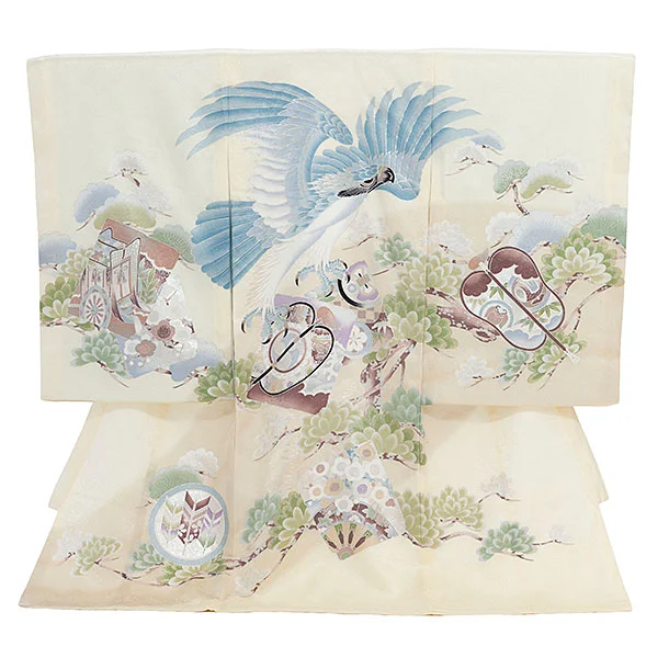 お祝い着をかける時は 絵柄がよく見える様に広げ抱いた子供の体を覆う様に掛け産着の付紐の一方を肩側から他方を脇から通して 抱き手の方の背で蝶結びにします。