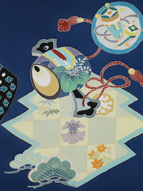 お祝い着をかける時は 絵柄がよく見える様に広げ抱いた子供の体を覆う様に掛け産着の付紐の一方を肩側から他方を脇から通して 抱き手の方の背で蝶結びにします。