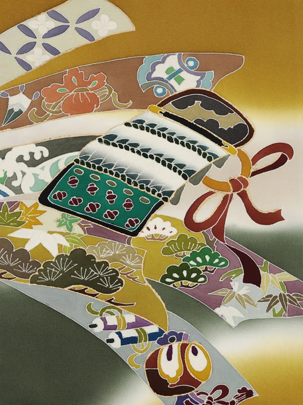 お祝い着をかける時は 絵柄がよく見える様に広げ抱いた子供の体を覆う様に掛け産着の付紐の一方を肩側から他方を脇から通して 抱き手の方の背で蝶結びにします。