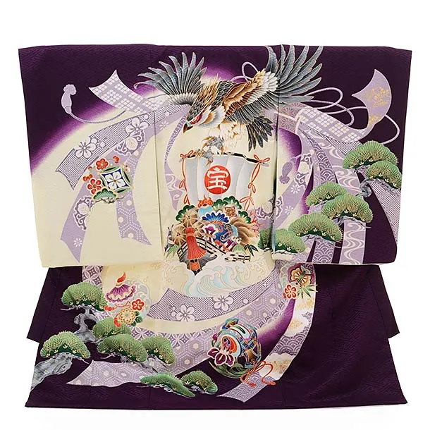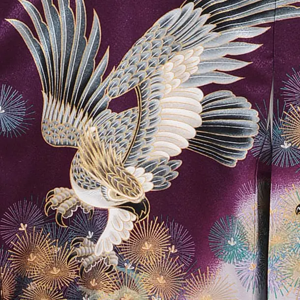 紫地に、鷹が描かれたお着物です。個性的な紫に、勇ましい鷹が映え、大変豪華な雰囲気です。背景の松が華やかな印象をより一層引き立てます。