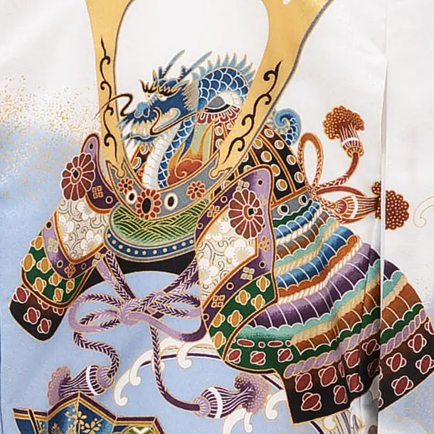 白地に、兜と扇が描かれたお着物です。勇壮な兜に、扇や小槌などのおめでたい柄が華やかで豪華な雰囲気です。神社へのお宮参りや記念撮影におすすめです。