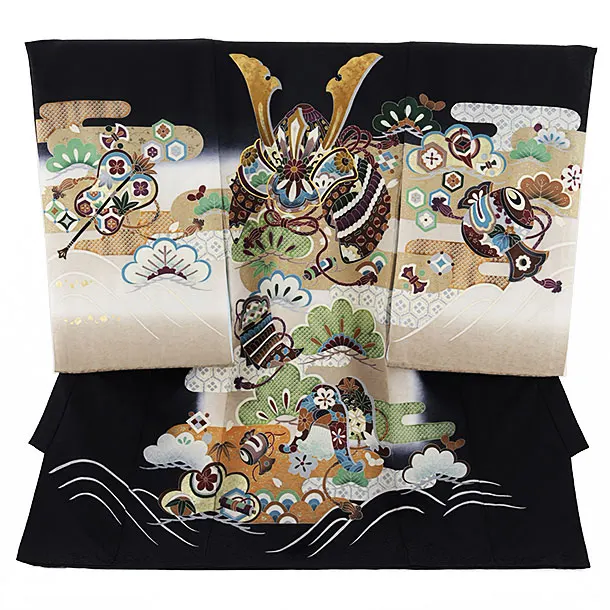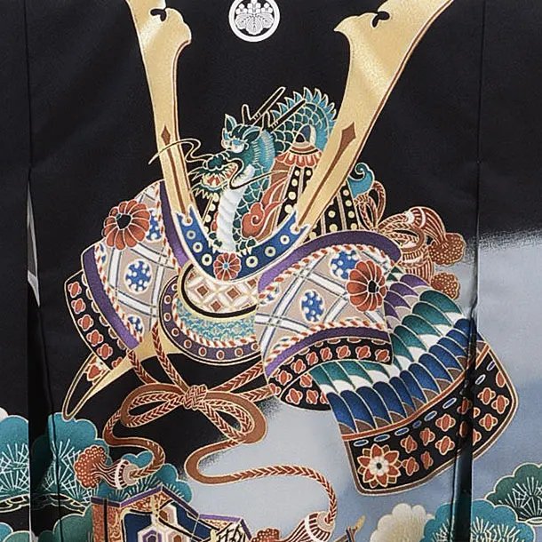 黒地に、兜と鼓(つづみ)が描かれたお着物です。凛々しい兜や鼓(つづみ)が正統派な雰囲気です。正統派な装いとして、お子様の健やかなる成長を願う日にふさわしい一枚です。丸に五三の桐の家紋が入っています。