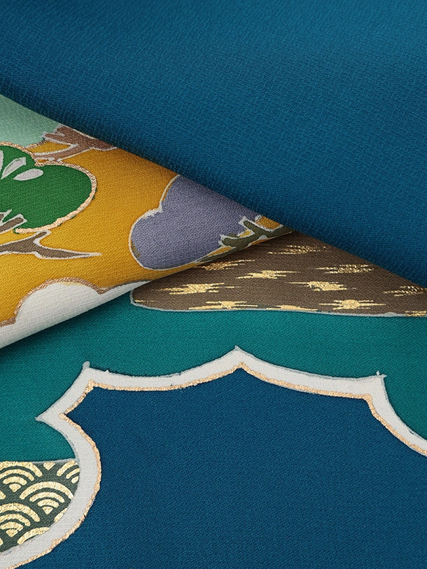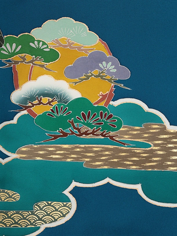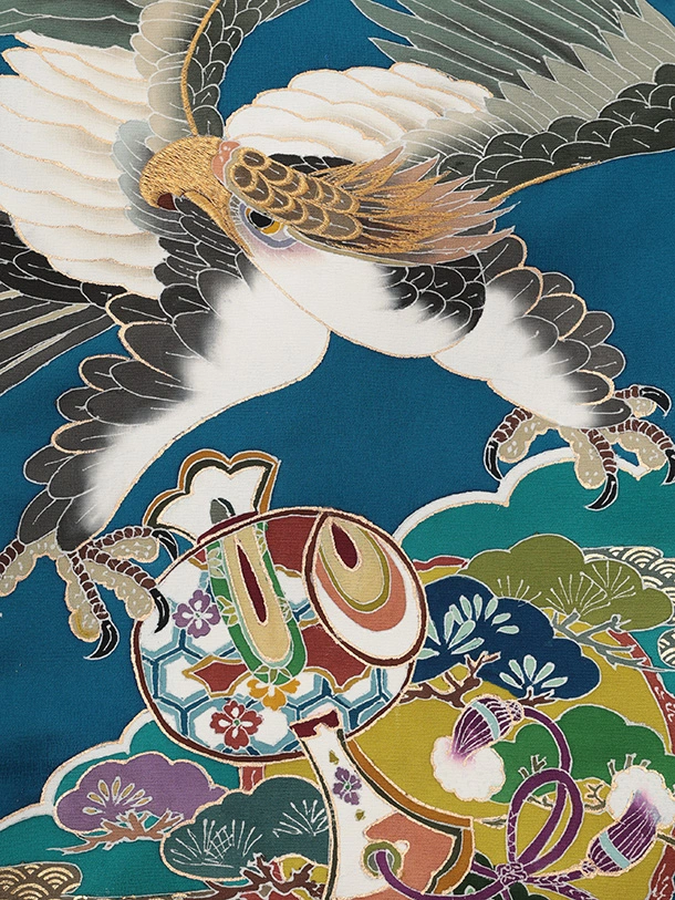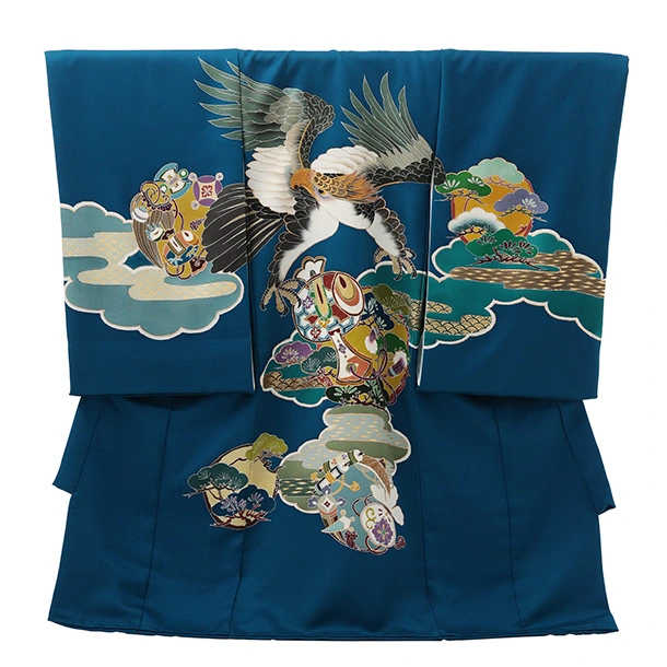 男児産着 お宮参りレンタルR034【高級正絹】青地雲取り 鷹 松