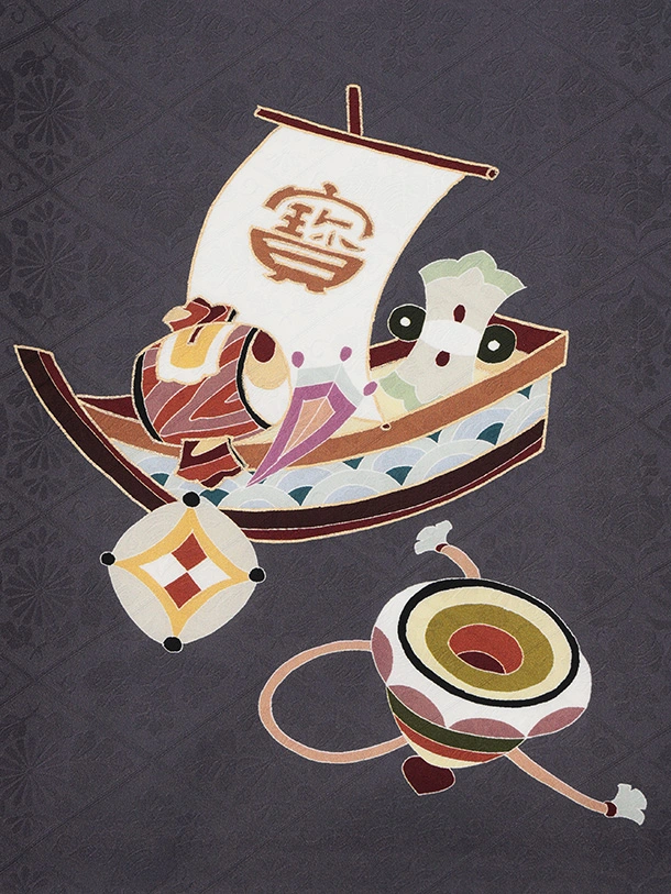 お祝い着をかける時は 絵柄がよく見える様に広げ抱いた子供の体を覆う様に掛け産着の付紐の一方を肩側から他方を脇から通して 抱き手の方の背で蝶結びにします。